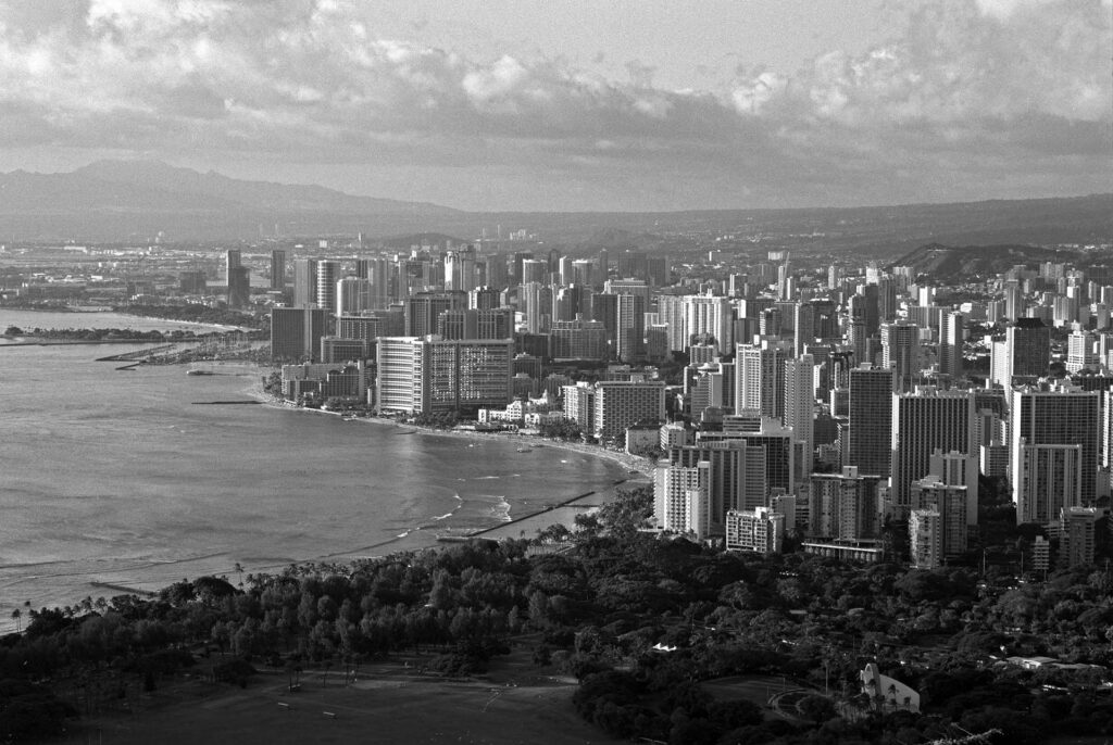 The longest of the Nikonos lenses is the 4-element 4-group 80mm f/4.0 W-Nikkor. I have never used this lens underwater. The Nikonos cameras do not have a coupled rangefinder, so the subject-to-camera distance has to be either guessed or measured using an external rangefinder. Nikon did make an accessory 80mm viewfinder (for use on land only), which itself needs to be adjusted for parallax depending on the distance to the subject. Thus, using the 80mm lens on the Nikonos is a slow process. The simple optical formula of this lens produces a not insignificant amount of chromatic aberration, limiting, for my taste, its use on color film. However, on black-and-white, I like its less-than-clinical rendering.