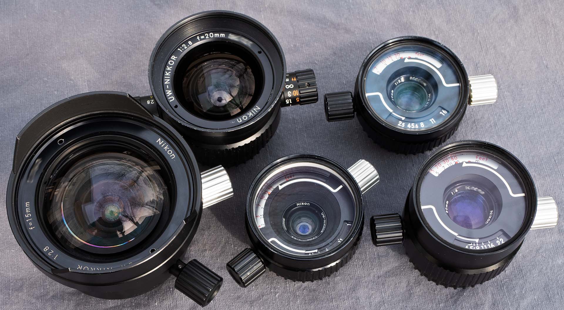 Because the refractive indices of air and water are different, putting a flat piece of glass in front of a lens and taking it underwater results in both, a narrowing of the field of view, and considerable edge distortion. Nikon (as well as others) solved this problem by adding an additional “water-contact” element to the front of their UW-Nikkor lenses. The four lenses are very well corrected, but cannot focus in air, and are therefore exclusively for underwater use.